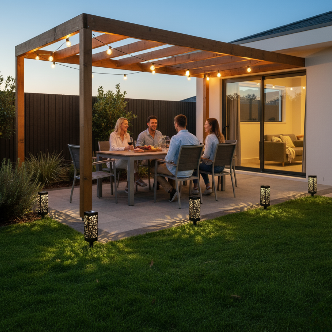 The patterned, warm-white glow feels luxe — guests notice the ambience, not the lights. Lines of solar path lights create a considered look that ties your landscaping together. No glare, no “too bright” hotspots — just calm, consistent outdoor solar lights that flatter plants, planters and edging. It’s that little lift that makes the backyard feel finished. And yes, you’ll hear the compliments.