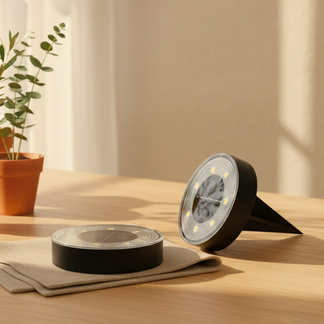 As a guide, place discs 1–2 metres apart for continuous, intentional coverage. For longest run time, install where the solar panel sees direct sun; shade or short winter days reduce nightly hours (normal for all solar lights).